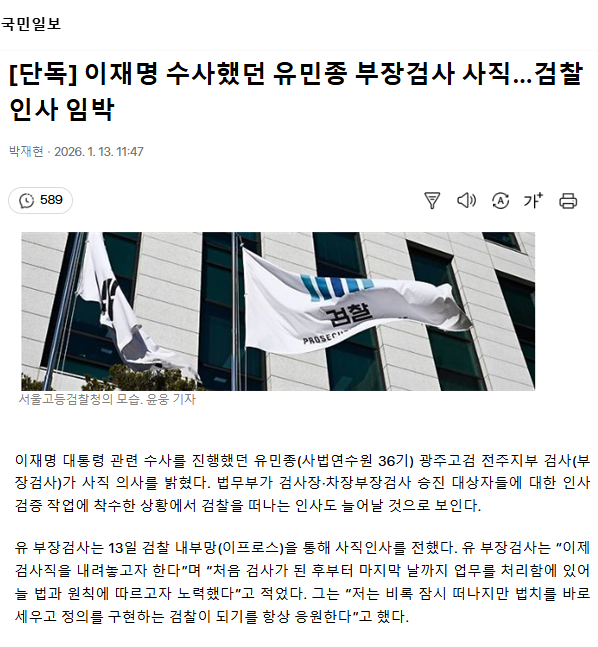 [단독] 이재명 수사했던 유민종 부장검사 사직… 검찰 인사 임박