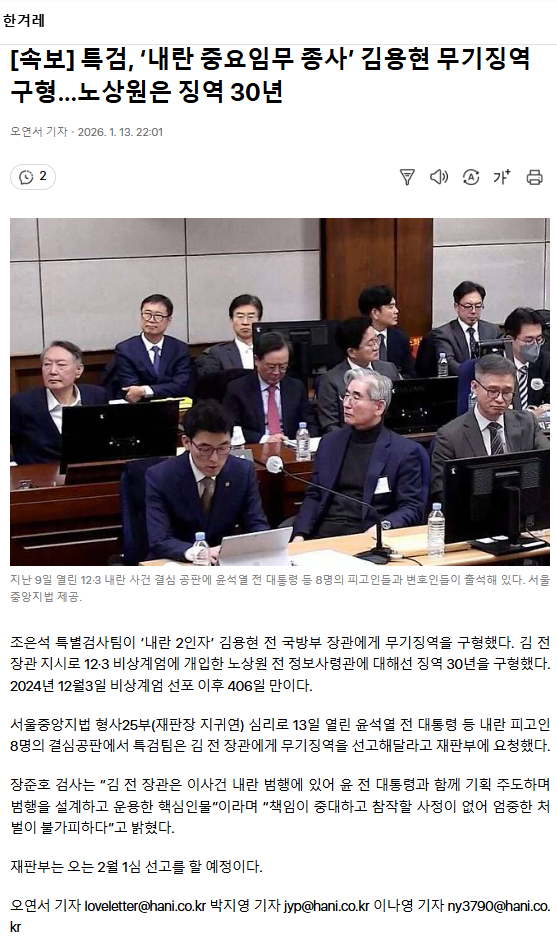 [속보] 특검, ‘내란 중요임무 종사’ 김용현 무기징역 구형… 노상원은 징역 30년