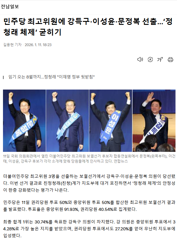 민주당 최고위원에 강득구·이성윤·문정복 선출… ‘정청래 체제’ 굳히기