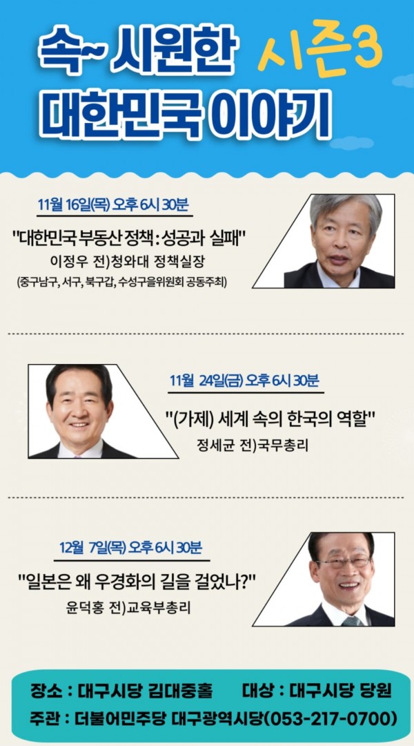 더불어민주당 대구시당에서 주최하고 주관하는 강의 [속~ 시원한 대한민국 이야기 시즌3] 행사가 있습니다.