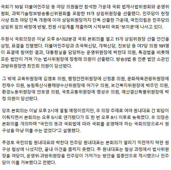 민주, 법사위·운영위 모두 가졌다…與 반발 속 11개 상임위원장 선출