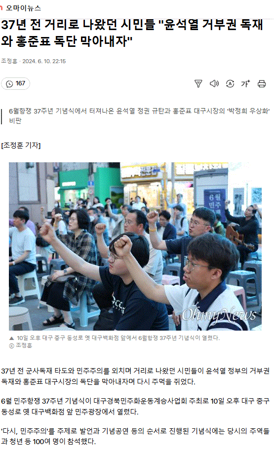 37년 전 거리로 나왔던 시민들 "윤석열 거부권 독재와 홍준표 독단 막아내자"
