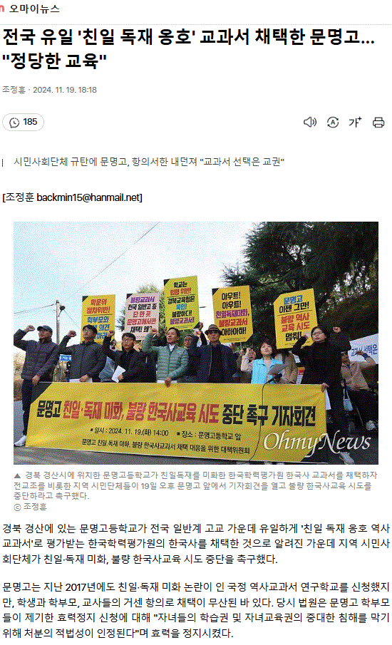 전국 유일 '친일 독재 옹호' 교과서 채택한 문명고... "정당한 교육"