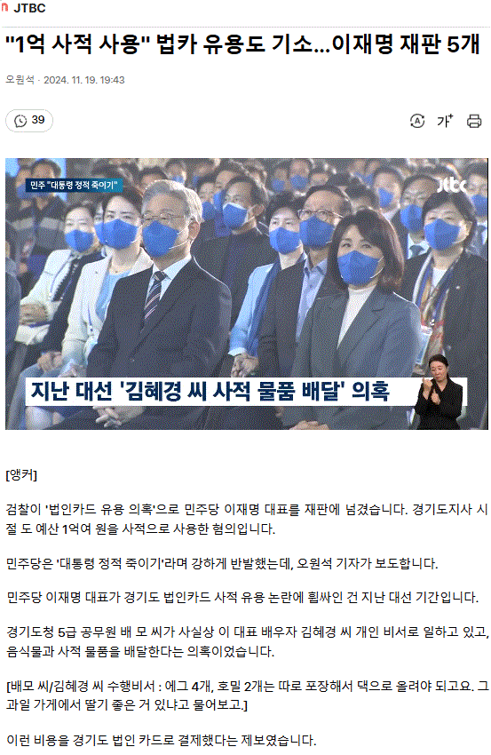 "1억 사적 사용" 법카 유용도 기소… 이재명 재판 5개