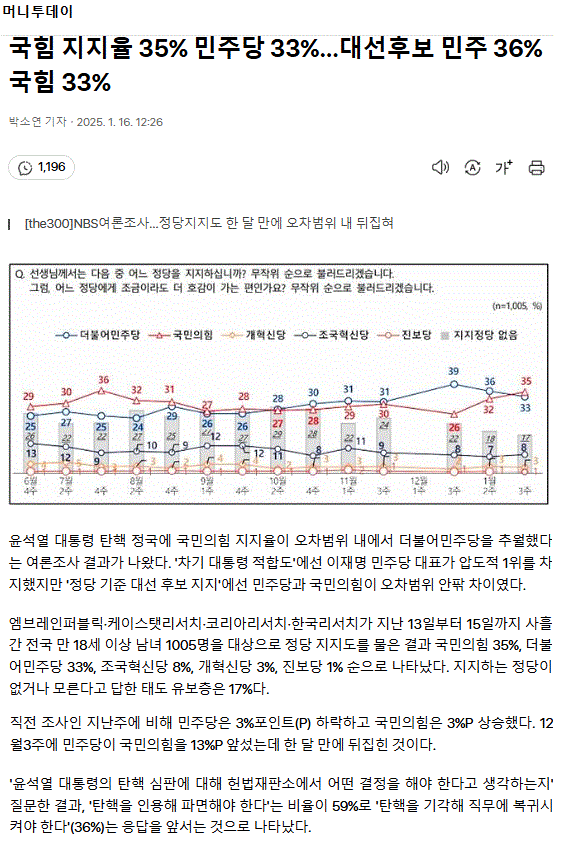 국힘 지지율 35% 민주당 33%… 대선후보 민주 36% 국힘 33% ㅡ 대선처럼 조작하냐