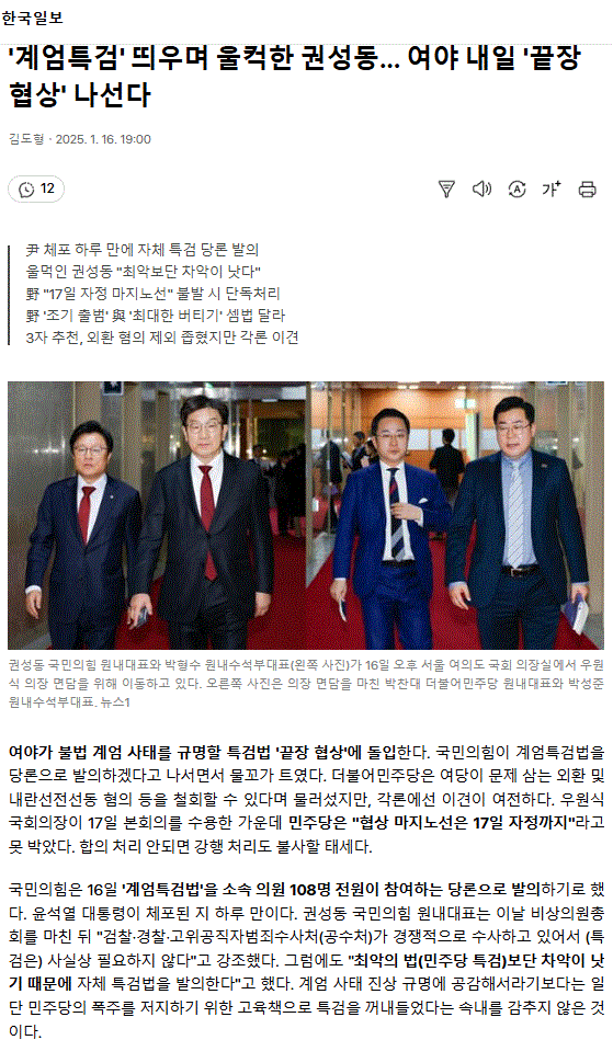 '계엄특검' 띄우며 울컥한 권성동… 여야 내일 '끝장 협상' 나선다 ㅡ 국힘말 들어줘야 하나