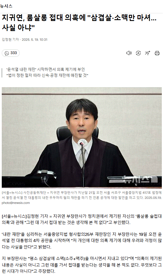 지귀연, 룸살롱 접대 의혹에 "삼겹살·소맥만 마셔… 사실 아냐" ㅡ 국회에서 사진 공개하라