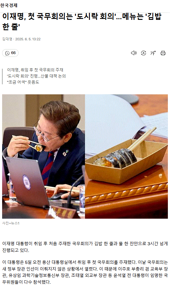 이재명, 첫 국무회의는 '도시락 회의'… 메뉴는 '김밥 한 줄'