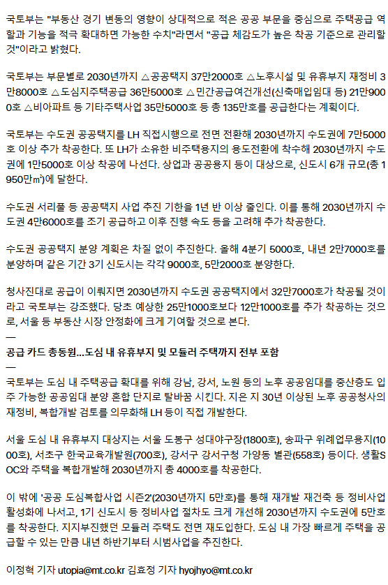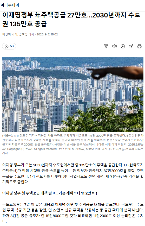 이재명정부 年주택공급 27만호... 2030년까지 수도권 135만호 공급ㅡ 인구 절벽, 수도권 집중