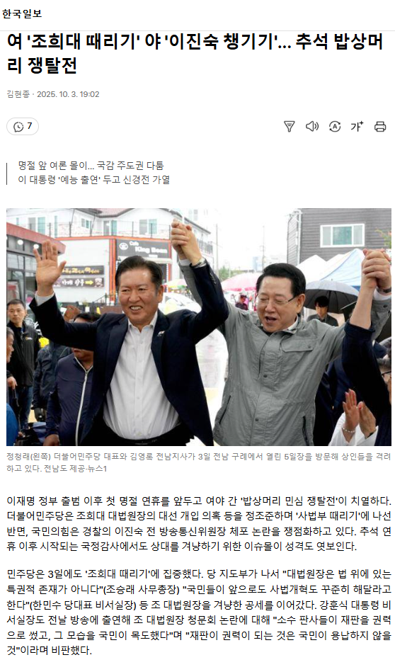 여 '조희대 때리기' 야 '이진숙 챙기기'... 추석 밥상머리 쟁탈전