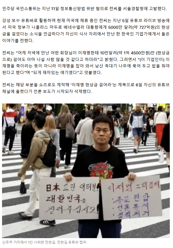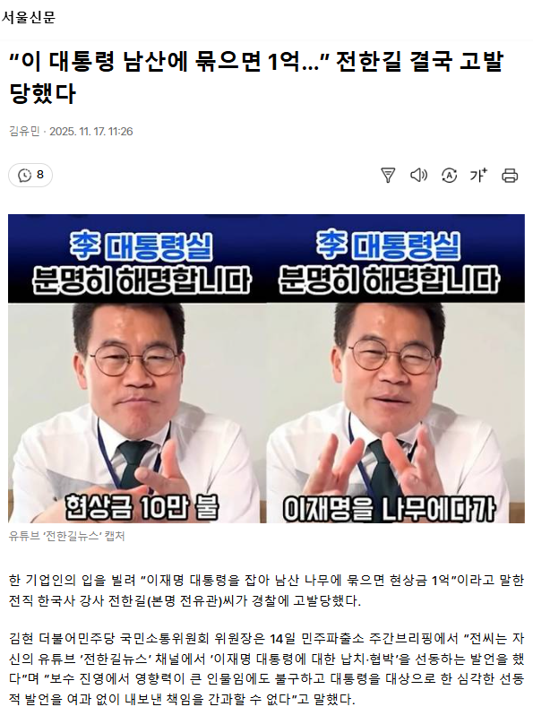 “이 대통령 남산에 묶으면 1억…” 전한길 결국 고발당했다 ㅡ 1억은 있냐, 전한길 즉각 수사해라