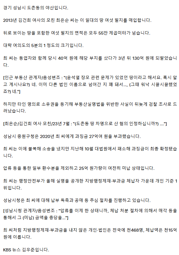 김건희 모친, 성남 땅 ‘차명 소유’ 과징금 25억 미납…고액 체납자 명단에 ㅡ 1위 체납자