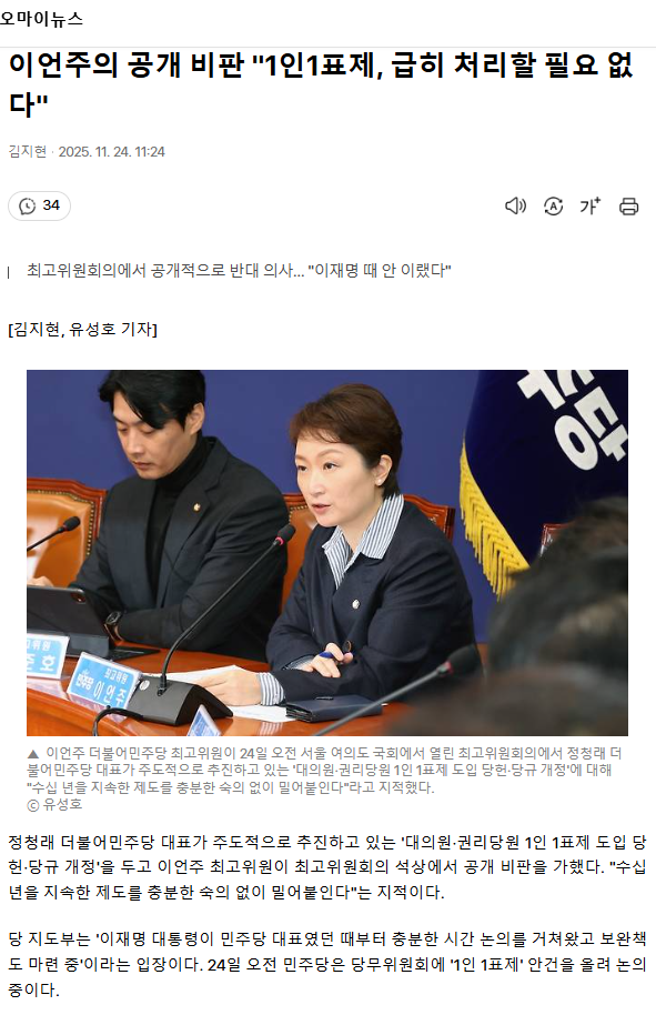 이언주의 공개 비판 "1인1표제, 급히 처리할 필요 없다"