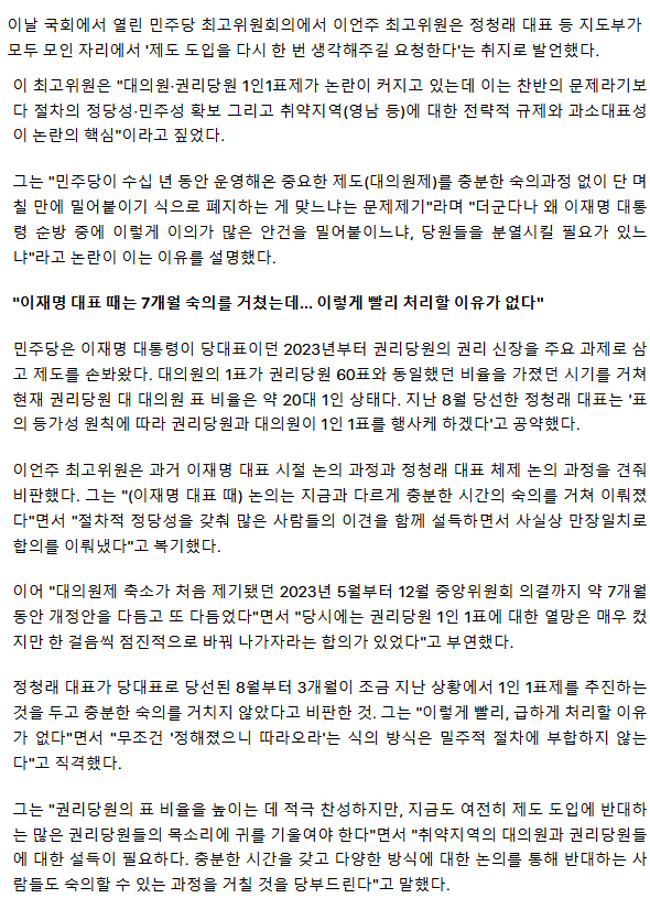 아무리 1인1표가 중요해도 충분한 숙의도 공감대도 없이 그저 국짐처럼 날치기 통과하면 다 되는겁니까? 그저 썩은정치렉카 김어준과 미쳐버린 딴지광신도들만 믿고 그것도 투표를 여론조사라고 사기까지 쳐 가면서 무리하게 진행하는 게 그게 정상적인거에요? 그게 여당 당대표가 할 일에요? 어디 핑계라도 대 보시죠 내란국짐이나 할 것같은 그따위 짓거리가 왜 우리 민주당에서 나와야 되냐고요