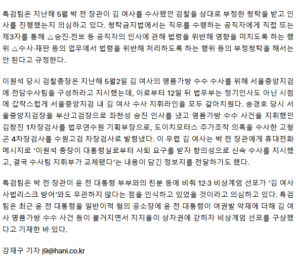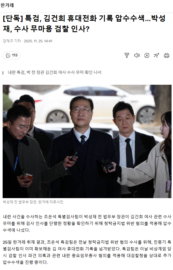[단독] 특검, 김건희 휴대전화 기록 압수수색… 박성재, 수사 무마용 검찰 인사? ㅡ박성재를 구속하라