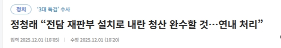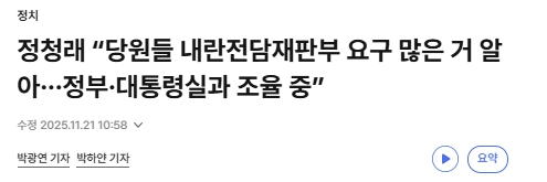 민주당은 재판도중 재판부 교체 위헌 우려로 보류를 한거고 정청래는 11.21일 대통령실 정부와 조율중이라고