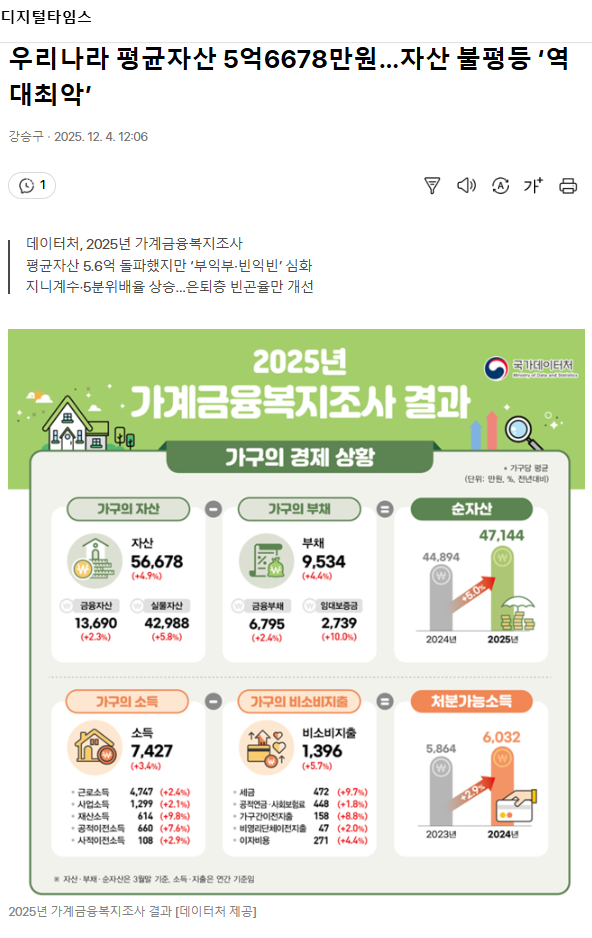 우리나라 평균자산 5억6678만원… 자산 불평등 ‘역대최악’