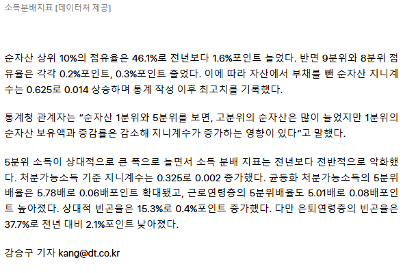 순자산 빈부격차 역대 최대‥ 소득 양극화도 심화