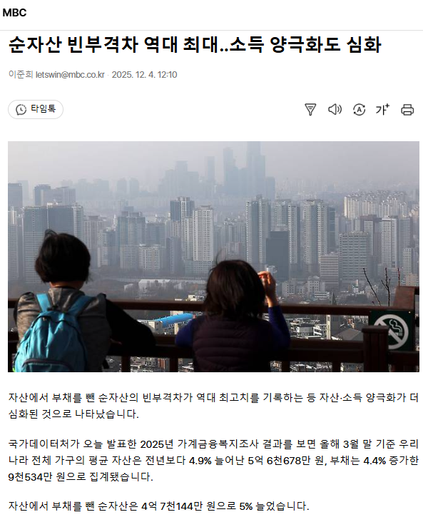 순자산 빈부격차 역대 최대‥ 소득 양극화도 심화