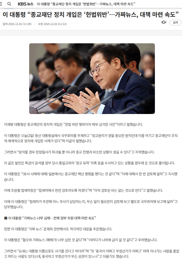 대통령님이 종교의 정치개입은 '헌법위반'으로 이를 방치할 경우 헌정질서 파괴 및 종교전쟁과 같은 상황이