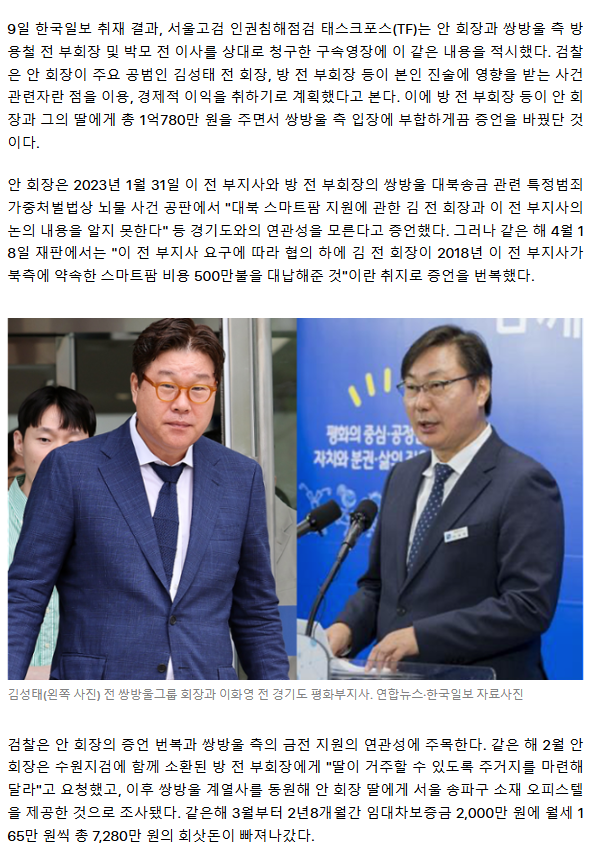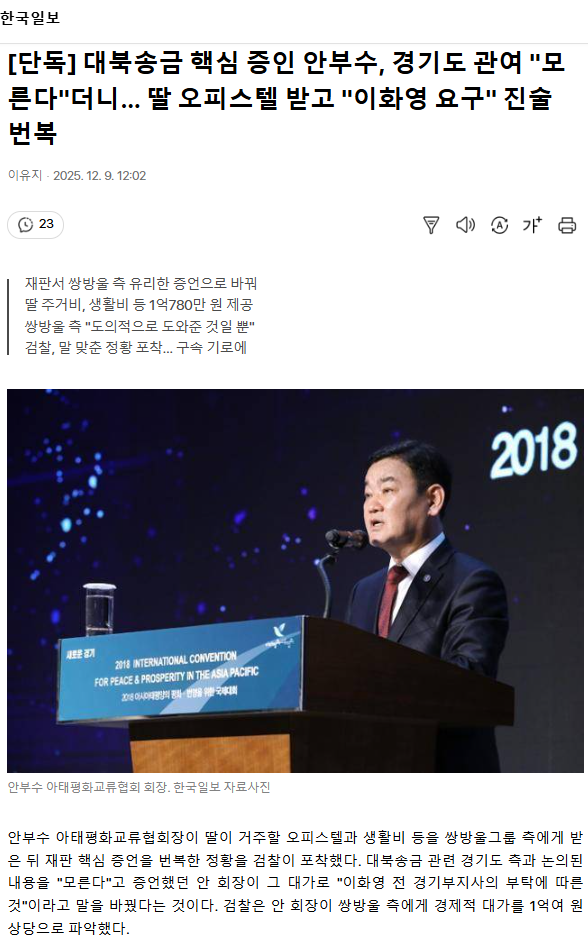 [단독] 대북송금 핵심 증인 안부수, 경기도 관여 "모른다"더니… 딸 오피스텔 받고 "이화영 요구" 진술 번복