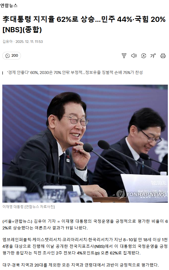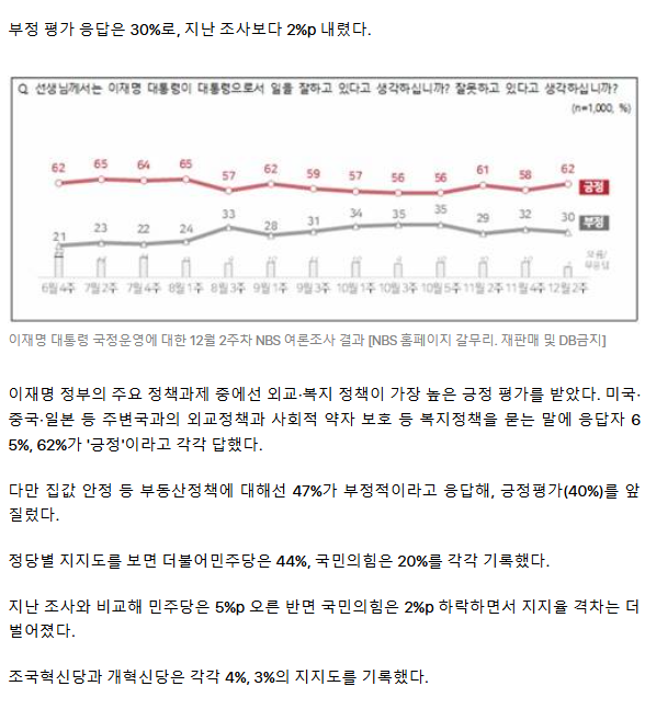 李대통령 지지율 62%로 상승… 민주 44%·국힘 20%[NBS] (종합) ㅡ 넘사벽 이재명 대통령