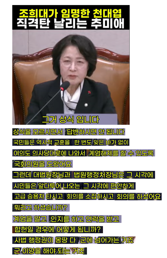 조희대가 임명한 천대엽에게 직격탄 날리는 추미애 위원장 ㅡ 국민과 싸우겠다는 거냐