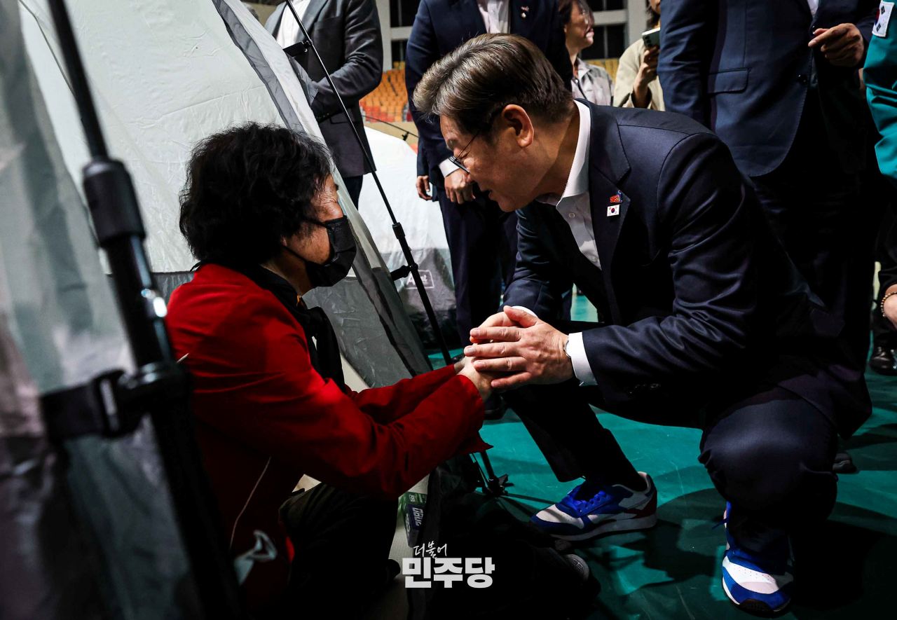 이재명 대통령 후보가 2025.05.17.(토) 광주광역시 광주여대에 마련된 금호타이어 광주공장 화재 대피소에 방문하여 이재민들에게 위로를 하고 있다.