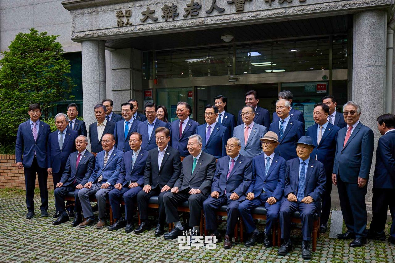 이재명 대통령후보가 2025.05.19.(월) 서울 용산구에 위치한 대한노인회에 방문하여 기념촬영을 하고 있다.