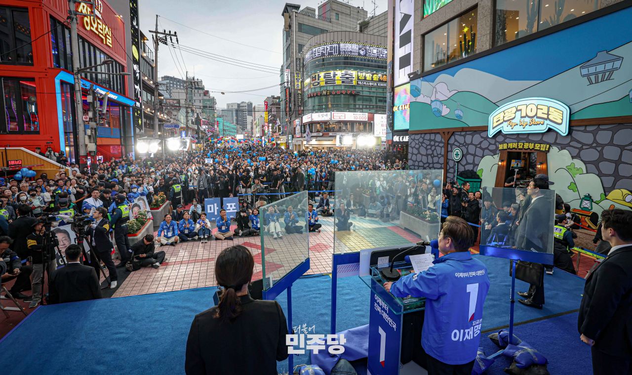 이재명 대통령 후보가 2025.05.19.(월) 서울 영등포구 타임스퀘어 광장 앞에서 유세를 하고 있다.