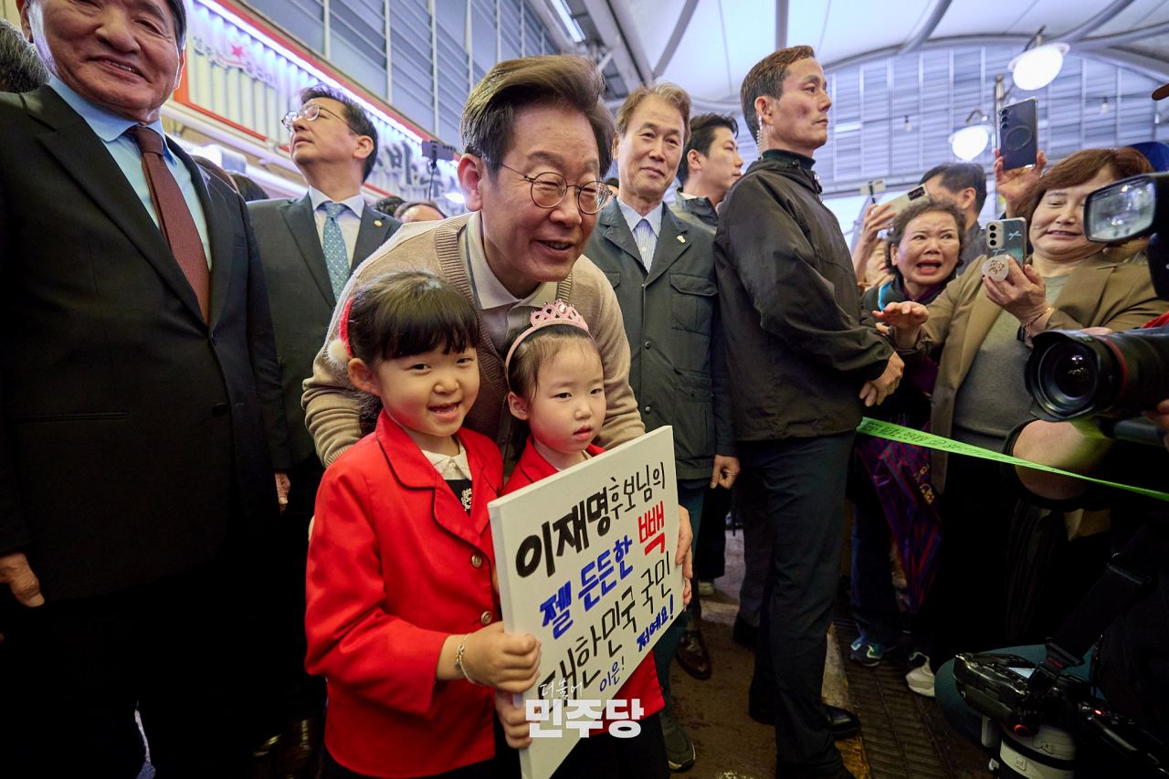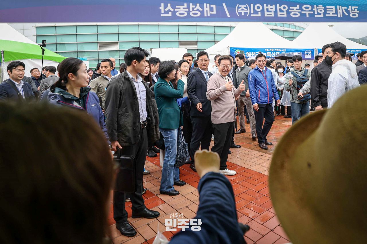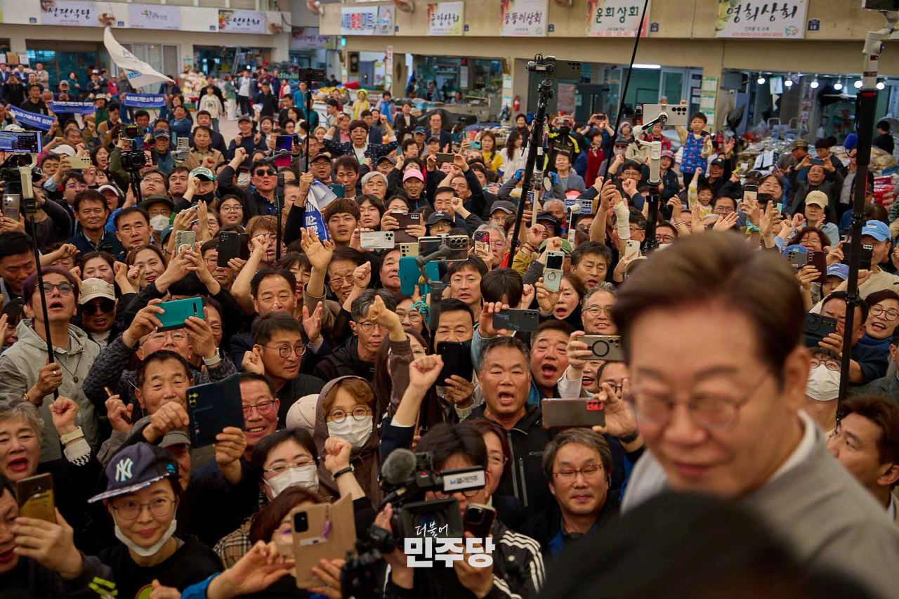 이재명 대통령 후보가 2025.05.11.(일) 전남 강진군에 위치한 강진오감통시장에 방문하여 시장상인들과 인사를 나누고 있다.