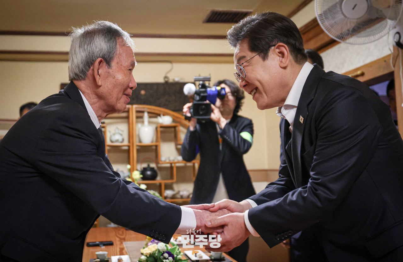 이재명 대통령 후보가 2025.05.10.(토) 경남 진주시에 위치한 한 전통찻집에서 김장하 이사장과 차담을 나누고 있다.