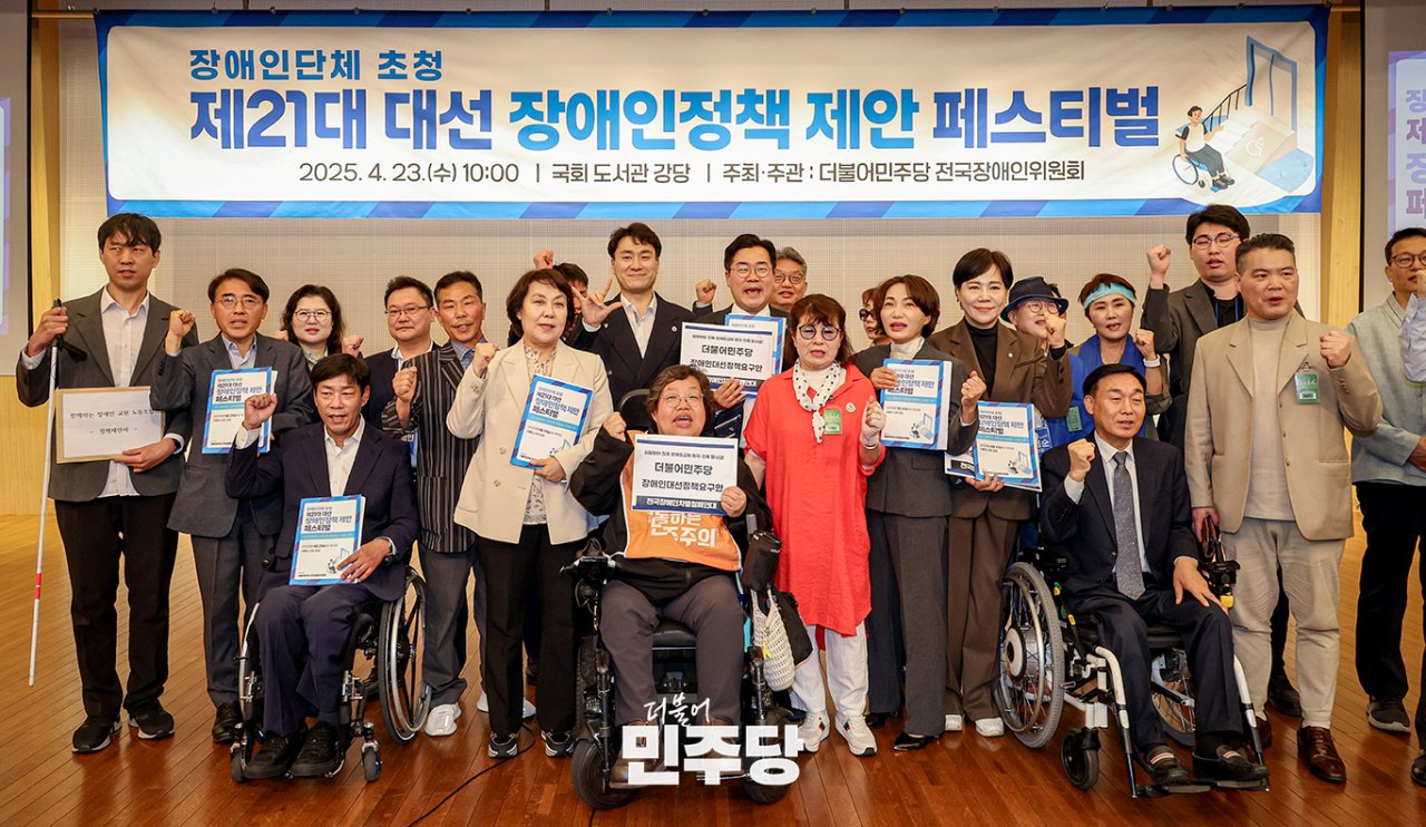 박찬대 당대표 직무대행 겸 원내대표가 2025.04.23.(수) 국회도서관 강당에서 열린 제21대 대선 장애인정책 제안 페스티벌에 참석하여 기념 촬영을 하고 있다.