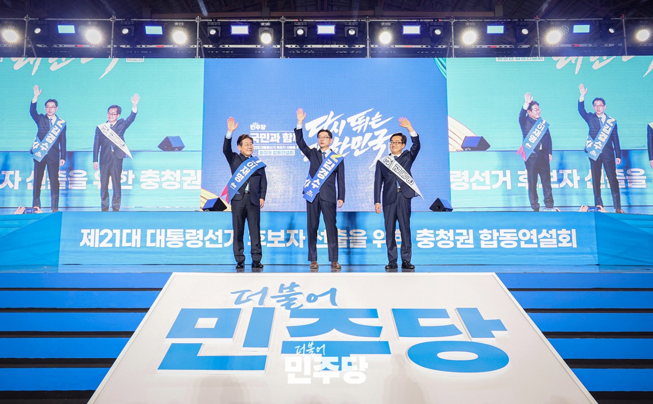 더불어민주당 제21대 대통령선거 후보자(왼쪽부터 기호1번 이재명, 기호2번 김경수, 기호3번 김동연)들이 2025.04.19.(토) 충청북도 청주시 청주체육관에서 열린 제21대 대통령선거 후보자 선출을 위한 충청권 합동연설회에 참석하여 객석을 향해 인사하고 있다.