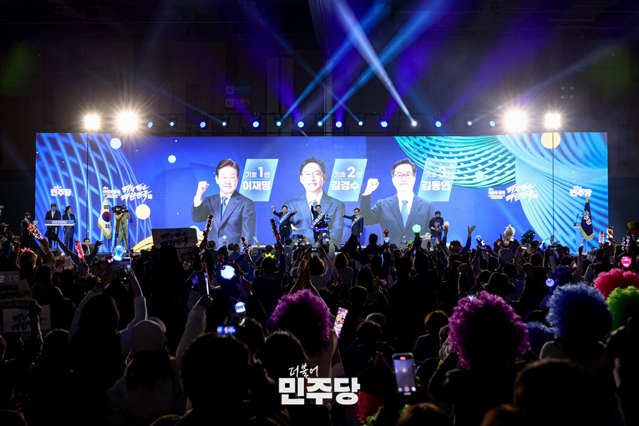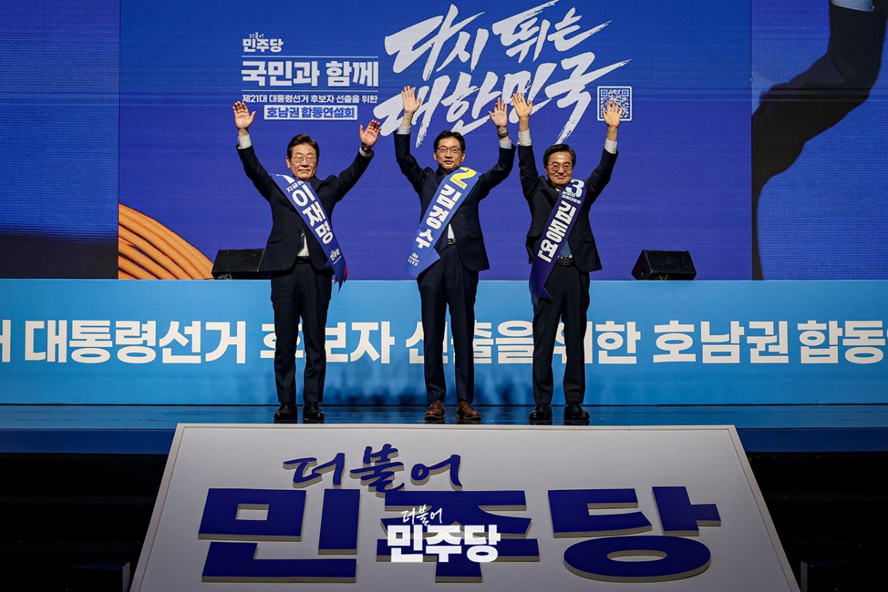더불어민주당 제21대 대통령선거 후보자(왼쪽부터 기호1번 이재명, 기호2번 김경수, 기호3번 김동연)들이 2025.04.26.(토) 광주광역시 김대중컨벤션센터에서 열린 제21대 대통령선거 후보자 선출을 위한 합동연설회에 참석하여 객석을 향해 인사하고 있다.
