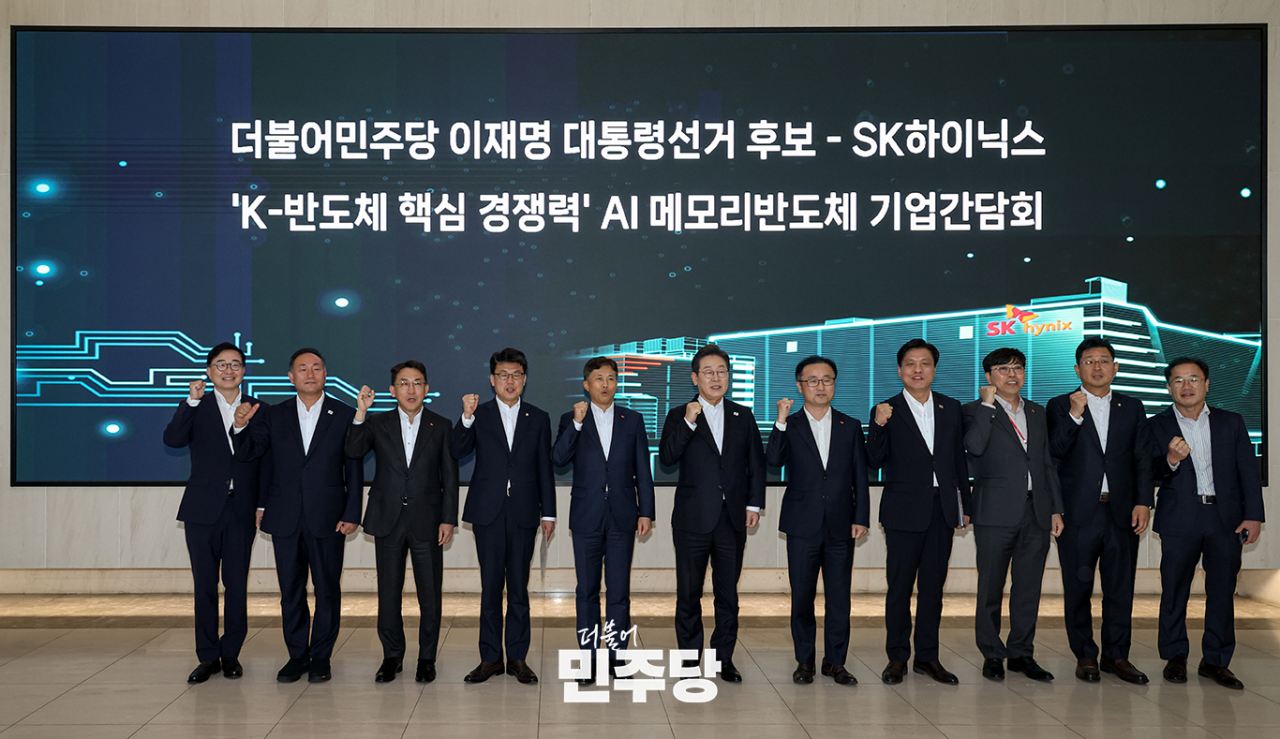 이재명 대통령선거 후보가 2025.04.28.(월) 경기도 이천시 SK하이닉스 이천캠퍼스에서 열린 ‘K-반도체’ AI메모리반도체 기업 간담회에 참석하여 기념 촬영을 하고 있다.