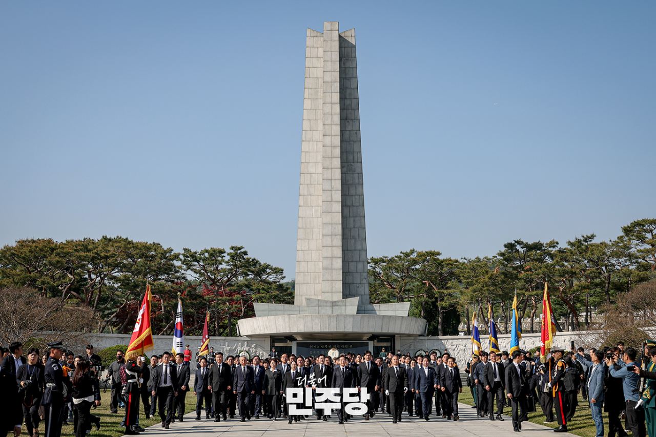 이재명 대통령선거 후보가 2025.04.28.(월) 서울 동작구 국립서울현충원에서 더불어민주당 국회의원과 함께 현충탑 참배를 마치고 현충문으로 걸어 나오고 있다.