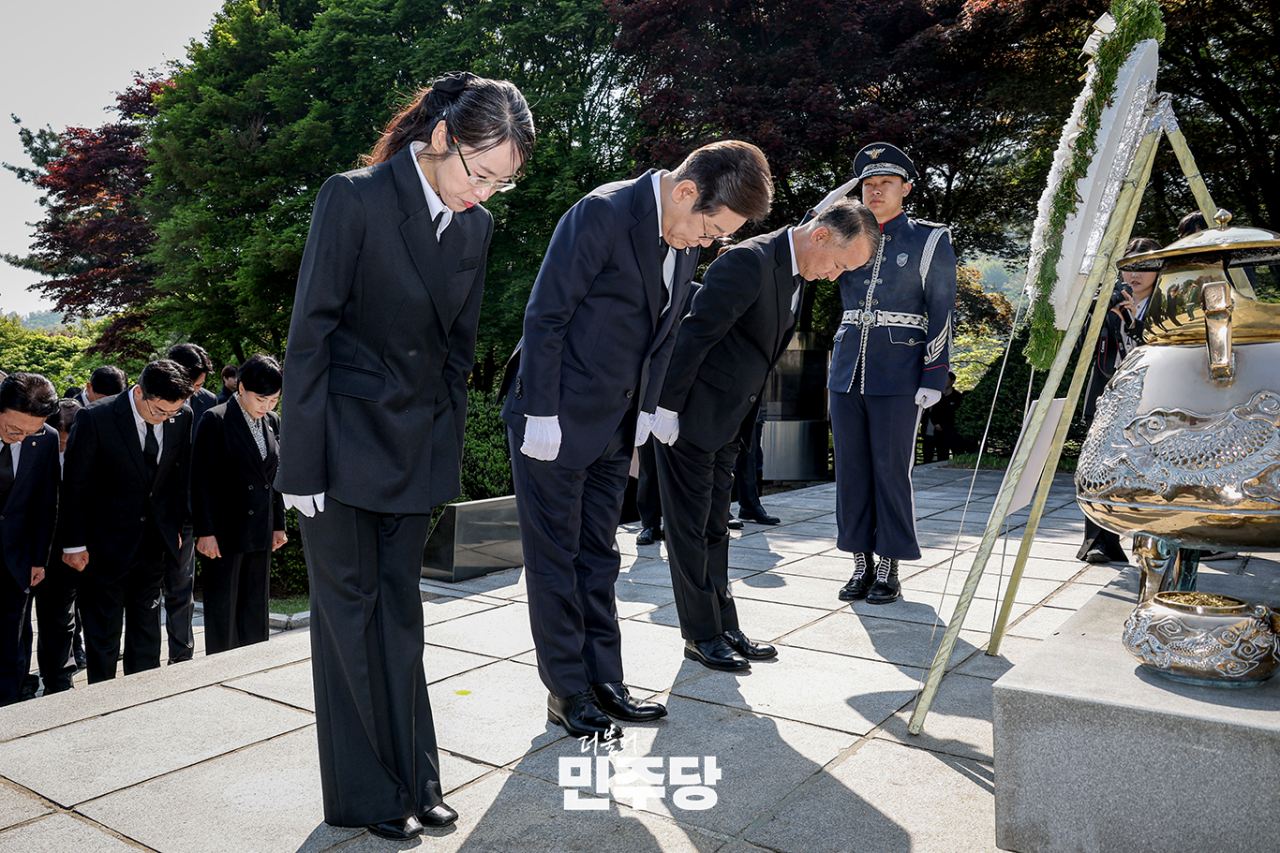 이재명 대통령선거 후보가 2025.04.28.(월) 서울 동작구 국립서울현충원에서 이승만, 박정희, 김대중, 김영삼 전 대통령과 박태준 전 국무총리 묘소를 찾아 참배하고 있다.