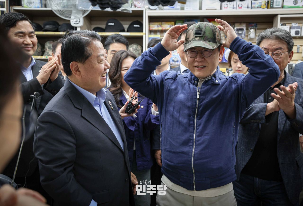 이재명 대통령후보가 2025.05.02.(금) 강원도 화천군에 방문하여 국민들과 인사를 나누고 군용품 상점에도 방문하여 군모를 착용해보고 있다.