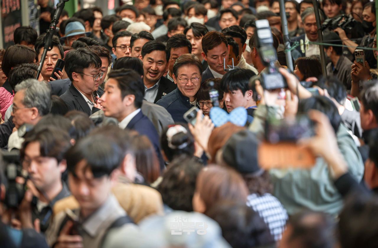 이재명 대선후보가 2025.05.01.(목) 경기도 연천군에 위치한 전곡읍내에 방문하여 국민들과 셀카를 찍고 있다.