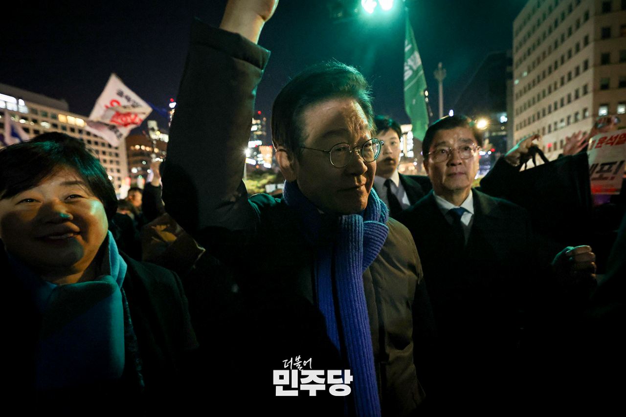 이재명 당대표가 2024.12.04.(수) 국회 본청 앞 계단에서 열린 윤석열 대통령 사퇴 촉구 · 탄핵 추진 범국민 촛불문화제에 참석하여 피켓을 들고 구호를 외치고 있다.