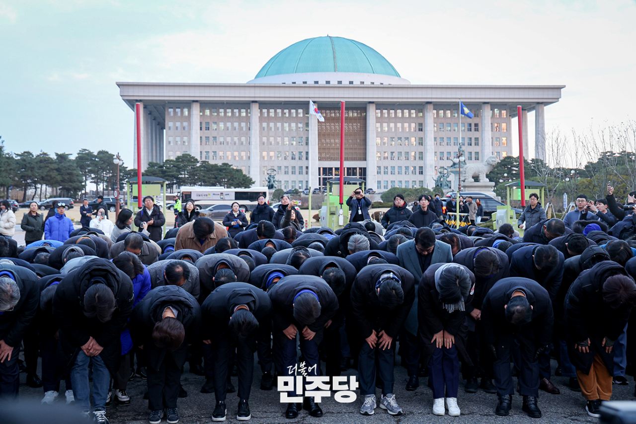 이재명 당대표와 민주당 소속 국회의원 전원이 2024.12.07.(토) 오전 7시경 국회의사당 정문에서 지난 6일부터 7일 밤새 국회를 지켜낸 시민들을 향해 감사 인사를 하고 있다.