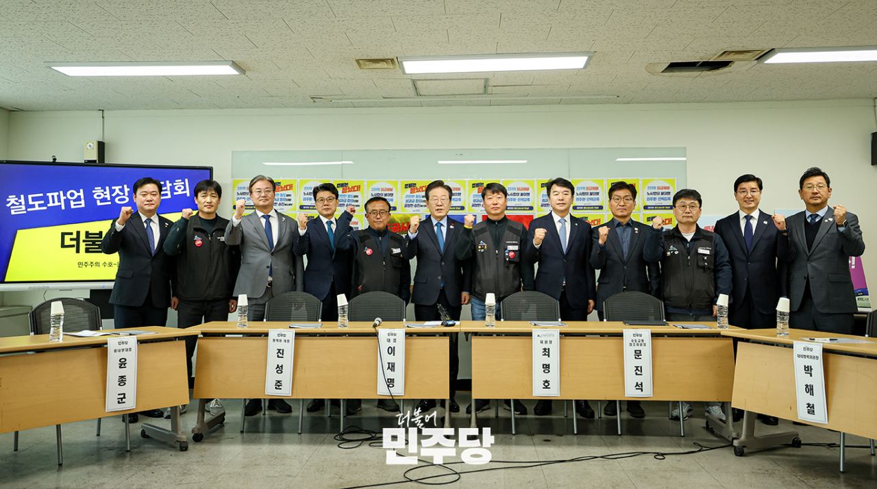 이재명 당대표가 2024.12.09.(월) 서울 철도회관에서 열린 철도파업 현장 간담회에 참석하여 기념 촬영을 하고 있다.