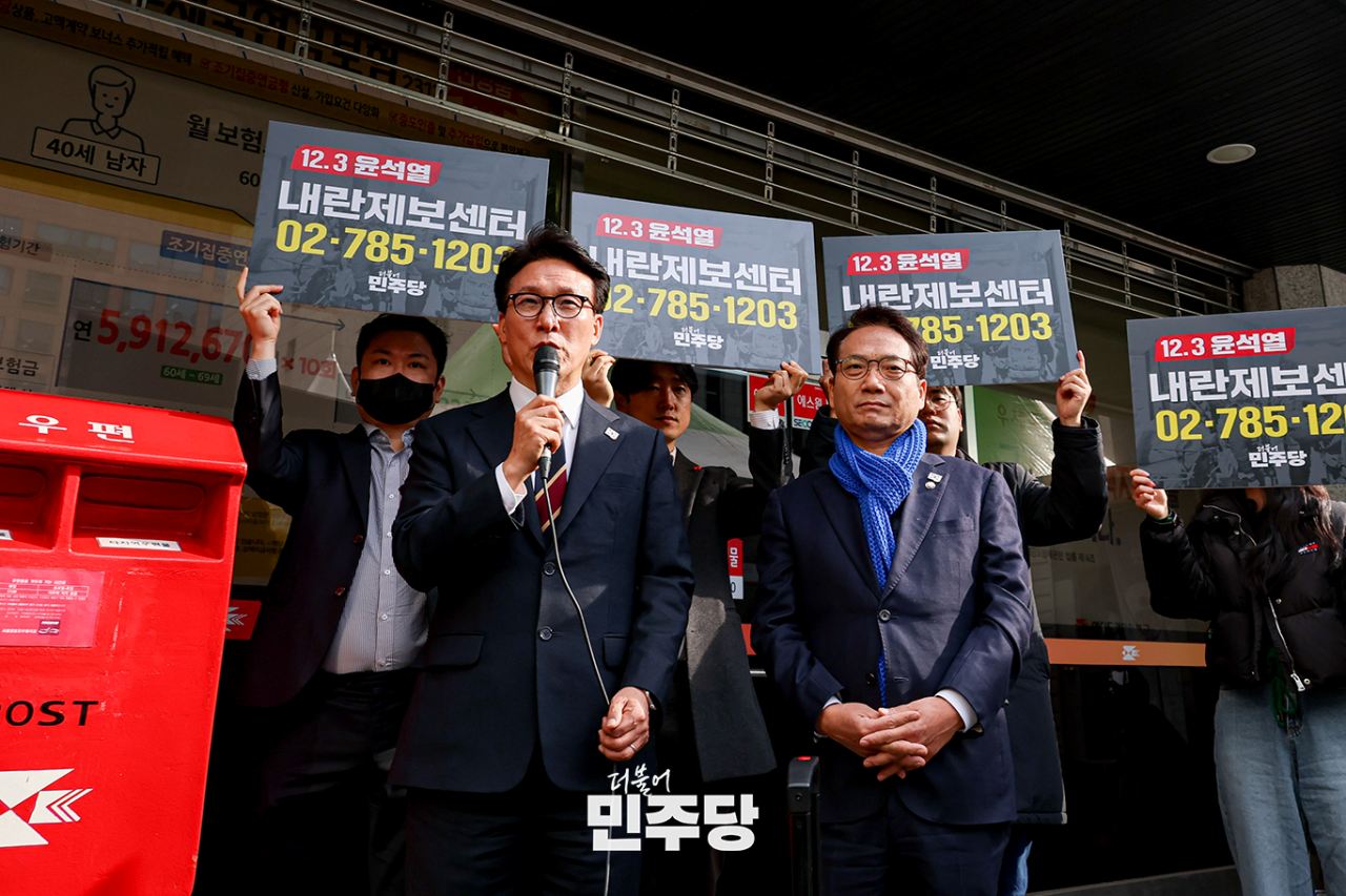 김민석 최고위원이 2024.12.11.(수) 서울 여의도 더불어민주당 당사 앞에서 열린 12.3 윤석열 내란사태 제보센터 현판식에 참석하여 발언하고 있다.