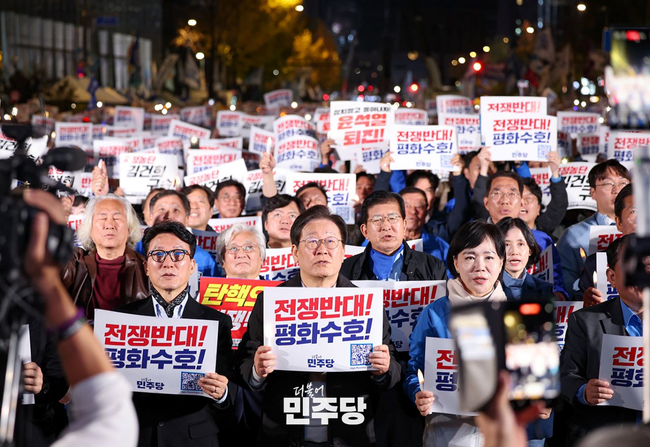 이재명 당대표가 2024.11.09.(토) 숭례문-시청역 구간에서 열린 김건희 윤석열 국정농단 규탄•특검 촉구 제2차 국민행동의 날 집회에 참석하여 피켓을 들고 있다.