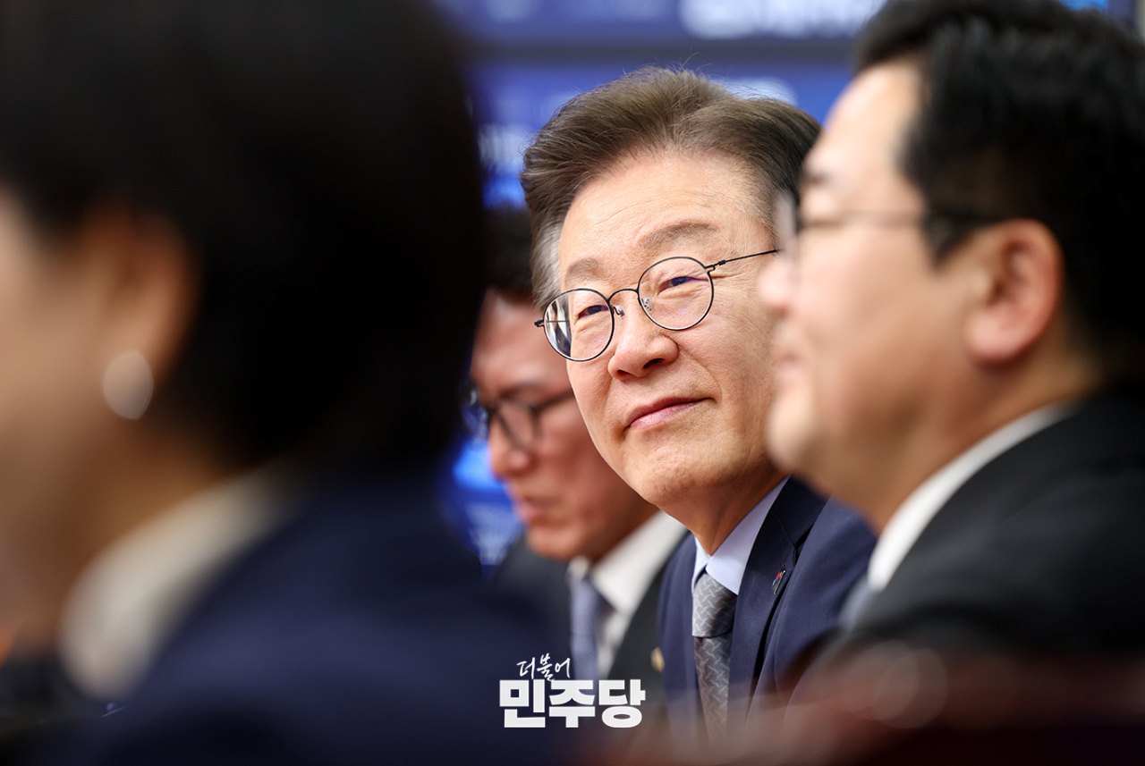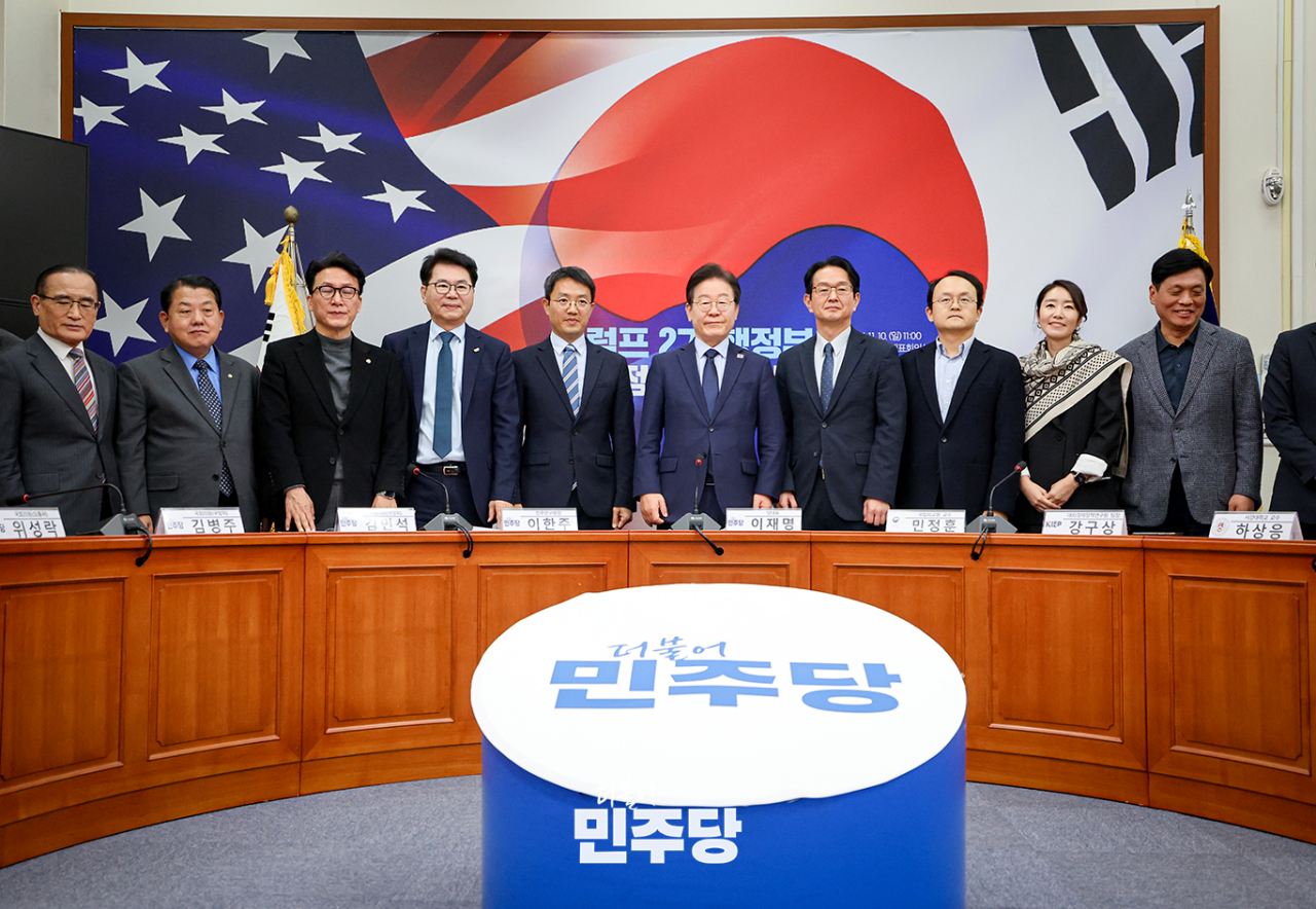 이재명 당대표가 2024.11.10.(일) 국회 본청 당대표회의실에서 열린 트럼프 2기 행정부 대외정책과 한반도 간담회에 참석하여 기념 촬영을 하고 있다.