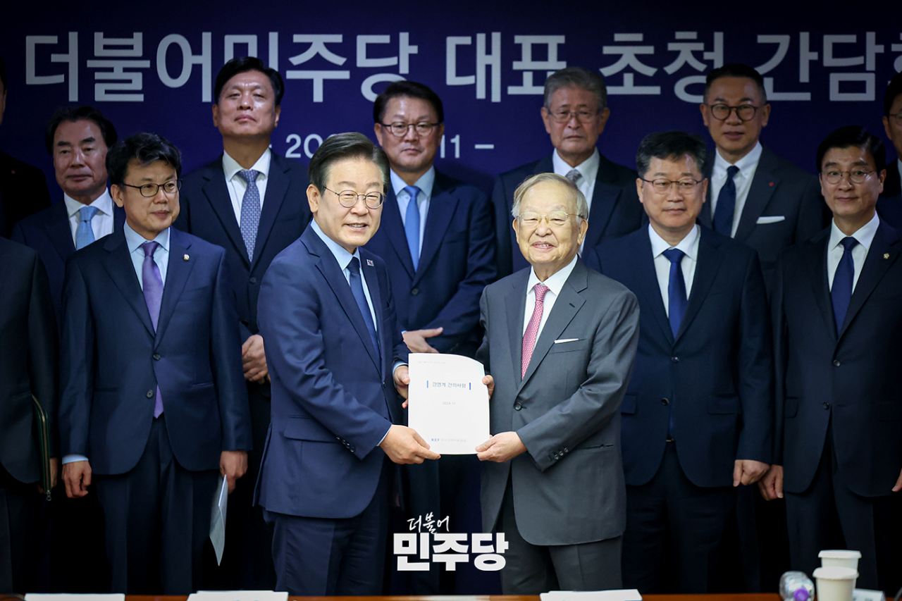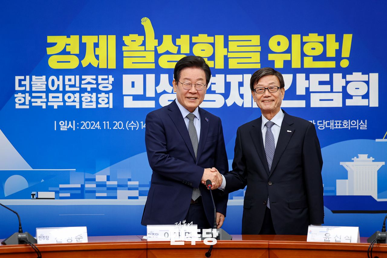 이재명 당대표가 2024.11.20.(수) 국회 본청 당대표회의실에서 열린 민생경제 간담회에 참석하여 윤진식 한국무역협회 회장과 악수하며 기념 촬영을 하고 있다.