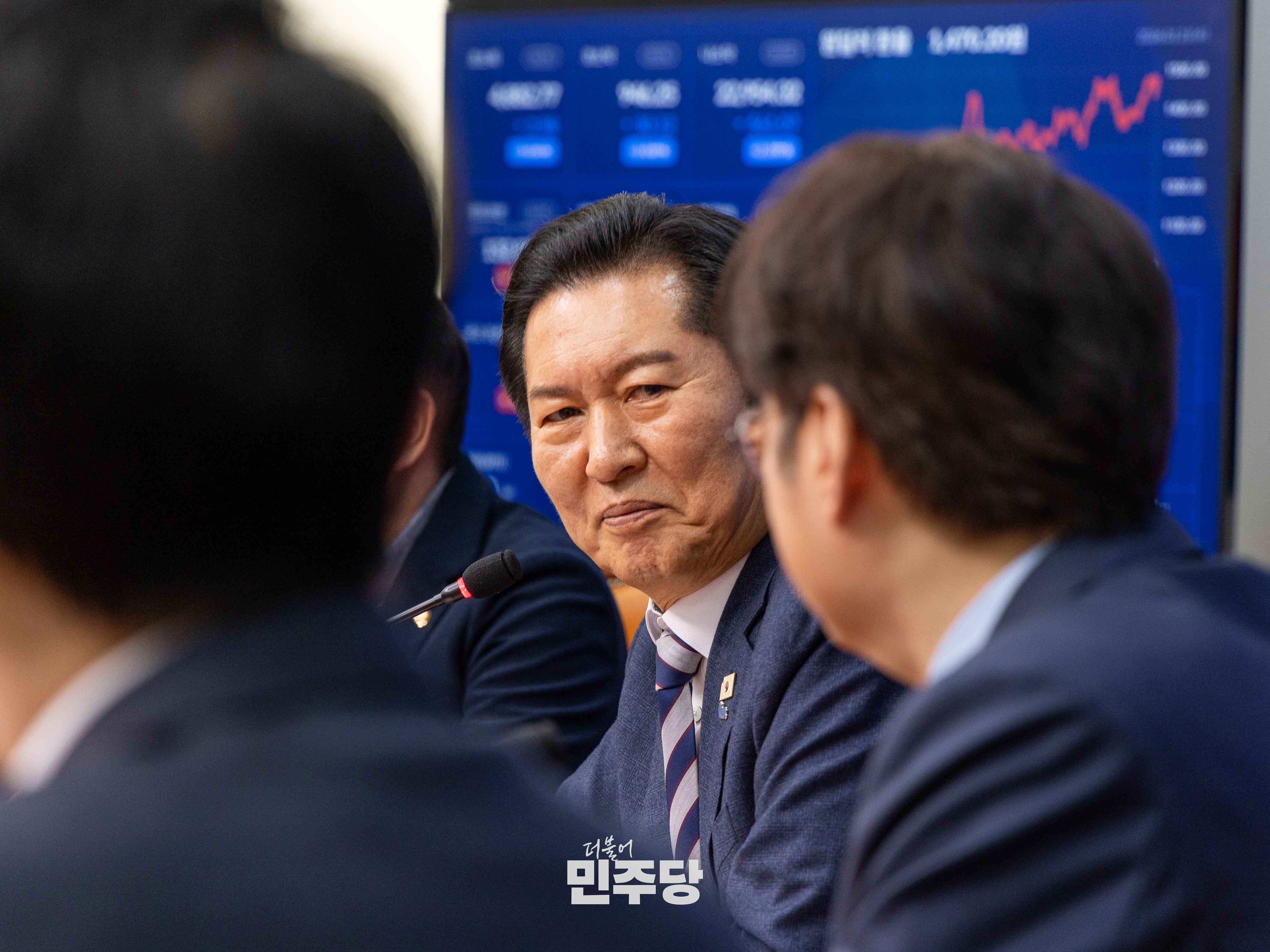 정청래 당대표가 2026.01.07.(수) 서울 송파구에 위치한 가락시장에 방문하여 민생 현장을 살펴본 뒤 서울농수산식품공사에서 현장최고위원회의를 주재하고 있다.