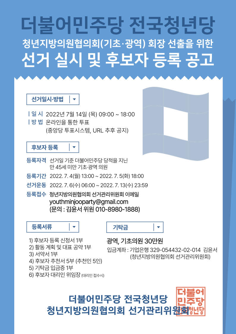더불어민주당 전국청년당 청년지방의원협의회(기초·광역) 회장 선출을 위한 선거 실시 및 후보자 등록 공고