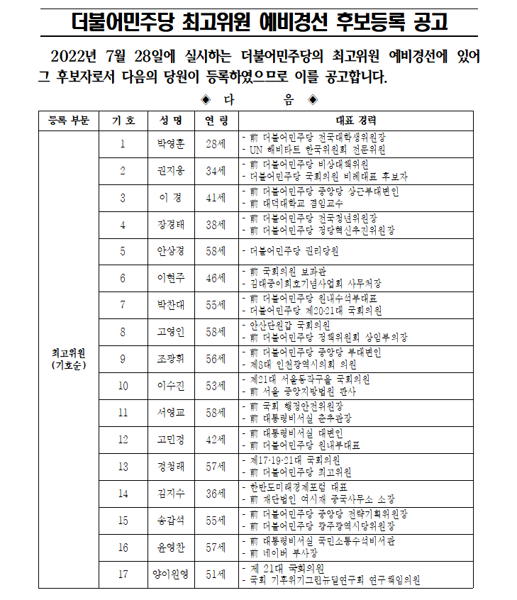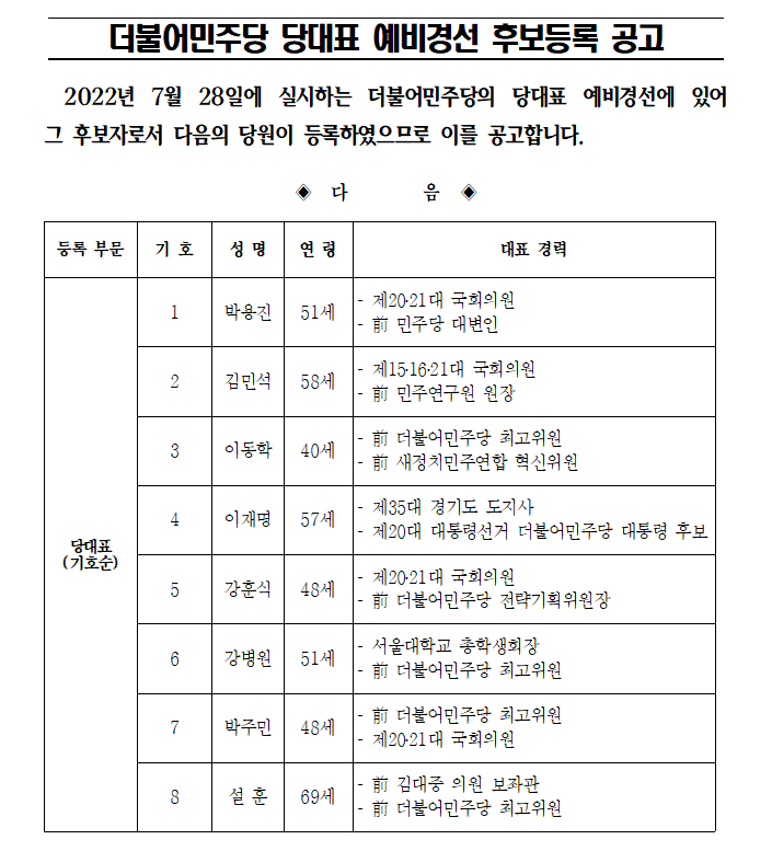 더불어민주당 당대표 및 최고위원 예비경선 후보등록 공고